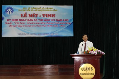 Sáng ngày 10/7/2019 tại Hội trường Trung tâm bồi dưỡng Chính trị Quận 5, Chi cục Dân số – Kế hoạch hóa gia đình Thành phố Hồ Chí Minh tổ chức Lễ mít – tinh kỷ niệm Ngày Dân số Thế giới 11/7 năm 2019 với chủ đề: “Việt Nam – 25 năm thực hiện Chương trình hành động Hội nghị Quốc tế về Dân số và Phát triển (ICPD Cairo, 1994”. Đến dự Lễ mít – tinh và phát biểu chỉ đạo có BS.CKII Nguyễn Hữu Hưng – Phó Giám đốc Sở Y tế Thành phố và gần 700 người tham dự là đại diện các Ban Thành ủy, Hội đồng nhân dân, Ủy ban nhân dân và các Sở, Ban Ngành, Đoàn thể Thành phố, quận – huyện, phường – xã; Lãnh đạo các Bệnh viện có chuyên khoa sản tuyến thành phố; Bệnh viện, Trung tâm Y tế 24 quận, huyện; Đại diện các phường – xã, thị trấn, khu phố – ấp được khen thưởng không có trường hợp sinh con thứ ba trở lên và phóng viên báo, đài đến dự và đưa tin.