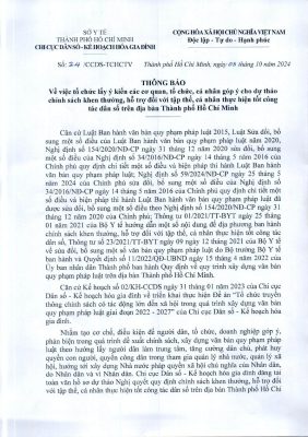 Văn bản Chi cục DS-KHHGĐ ban hànhThông Báo Quan TrọngTHÔNG BÁO Về việc tổ chức lấy ý kiến các cơ quan, tổ chức, cá nhân góp ý cho dự thảo chính sách khen thưởng, hỗ trợ đối với tập thể, cá nhân thực hiện tốt công tác dân số trên địa bàn Thành phố Hồ Chí MinhBởi admin12ba - Thứ Năm, 03/10/20240250FacebookTwitterPinterestWhatsApp Đính kèm Thông báo và các dự thảo đính kèm: tại đây.