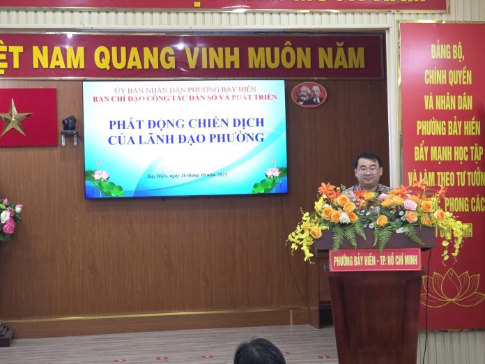 Ông Đỗ Võ An Trường – Ủy viên Ban Thường vụ Đảng ủy, Phó Chủ tịch Ủy ban nhân dân – Trưởng Ban chỉ đạo Dân số và Phát triển phường triển khai chiến dịch năm 2025; đồng thời phát động chiến dịch truyền thông lồng ghép cung cấp dịch vụ nâng cao chất lượng dân số tại vùng mức sinh thấp năm 2025 trên địa bàn phường.