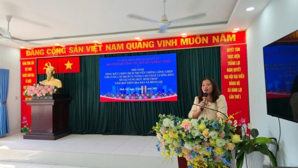 Bà  Phạm Thanh Tùng – Phó Trưởng Phòng Văn hóa – Xã hội, Phó Ban Thường trực Ban Chỉ đạo công tác Dân số và Phát triển xã Bình Lợi báo cáo tổng kết kết quả thực hiện chiến dịch.