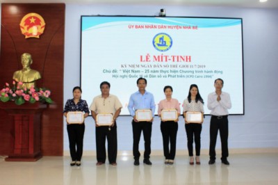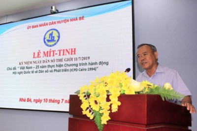 Chiều 10/7, UBND huyện Nhà Bè đã tổ chức lễ mít tinh kỷ niệm Ngày Dân số thế giới 11/7, chủ đề “Việt Nam – 25 năm thực hiện Chương trình hành động Hội nghị Quốc tế về Dân số và phát triển (ICPD Cairo, 1994)”.
