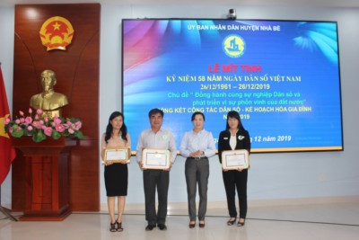 Dịp này, có 3 tập thể và 4 cá nhân được Sở Y tế TPHCM khen thưởng; 14 cá nhân được UBND huyện Nhà Bè tuyên dương khen thưởng có thành tích trong công tác DS-KHHGĐ năm 2019; 1 cá nhân được Huyện khen thưởng đột xuất vì có thành tích xuất sắc trong công tác cập nhật kho dữ liệu dân số năm 2019.