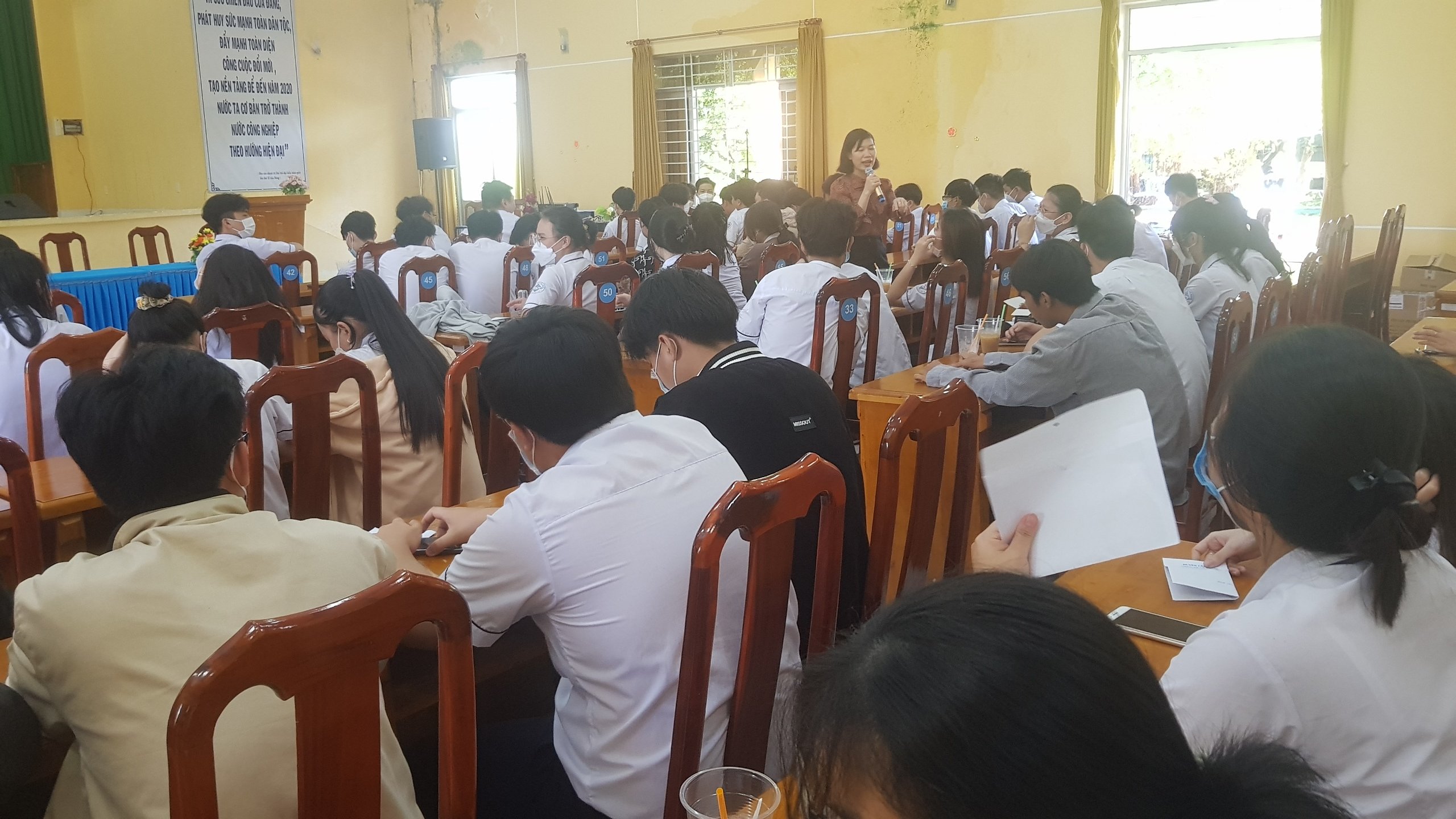 Bà Trần Thị Hồng – Phó Trưởng phòng khám sức khỏe sinh sản thành phố tại buổi nói chuyện với học sinh lớp 12 trường THPT An Nghĩa nhân dịp tiếp sức mùa thi năm 2022 trên địa bàn xã Lý Nhơn.