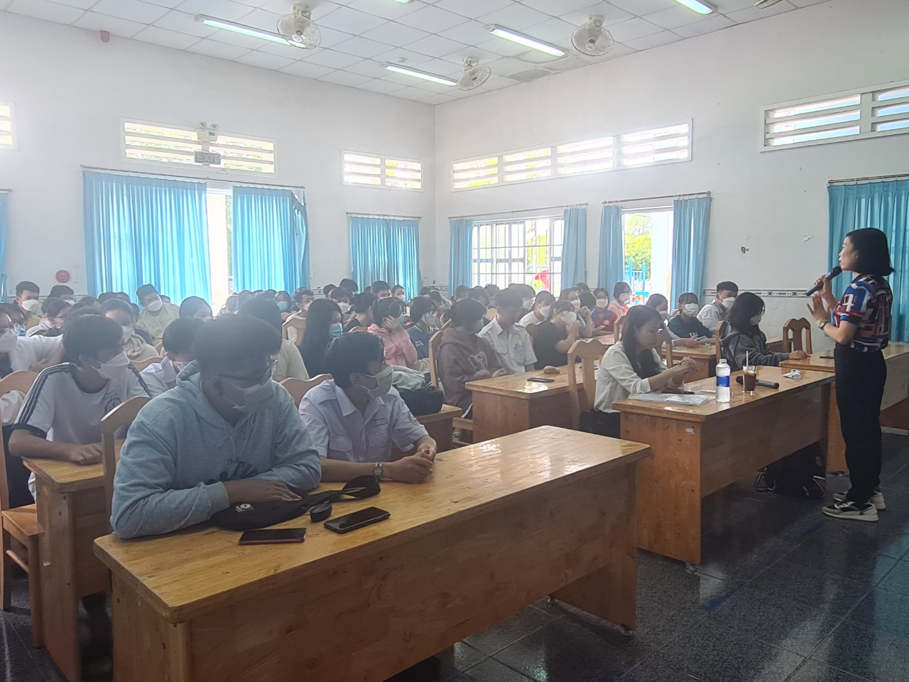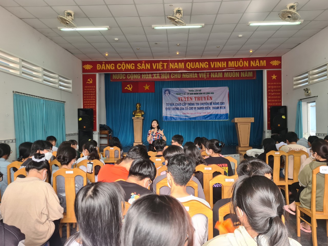 Bà Trần Thị Hồng – Phó Trưởng phòng khám sức khỏe sinh sản thành phố tại buổi nói chuyện với học sinh lớp 12 trường THPT Cần Thạnh nhân dịp tiếp sức mùa thi năm 2022 trên địa bàn xã Long Hòa.