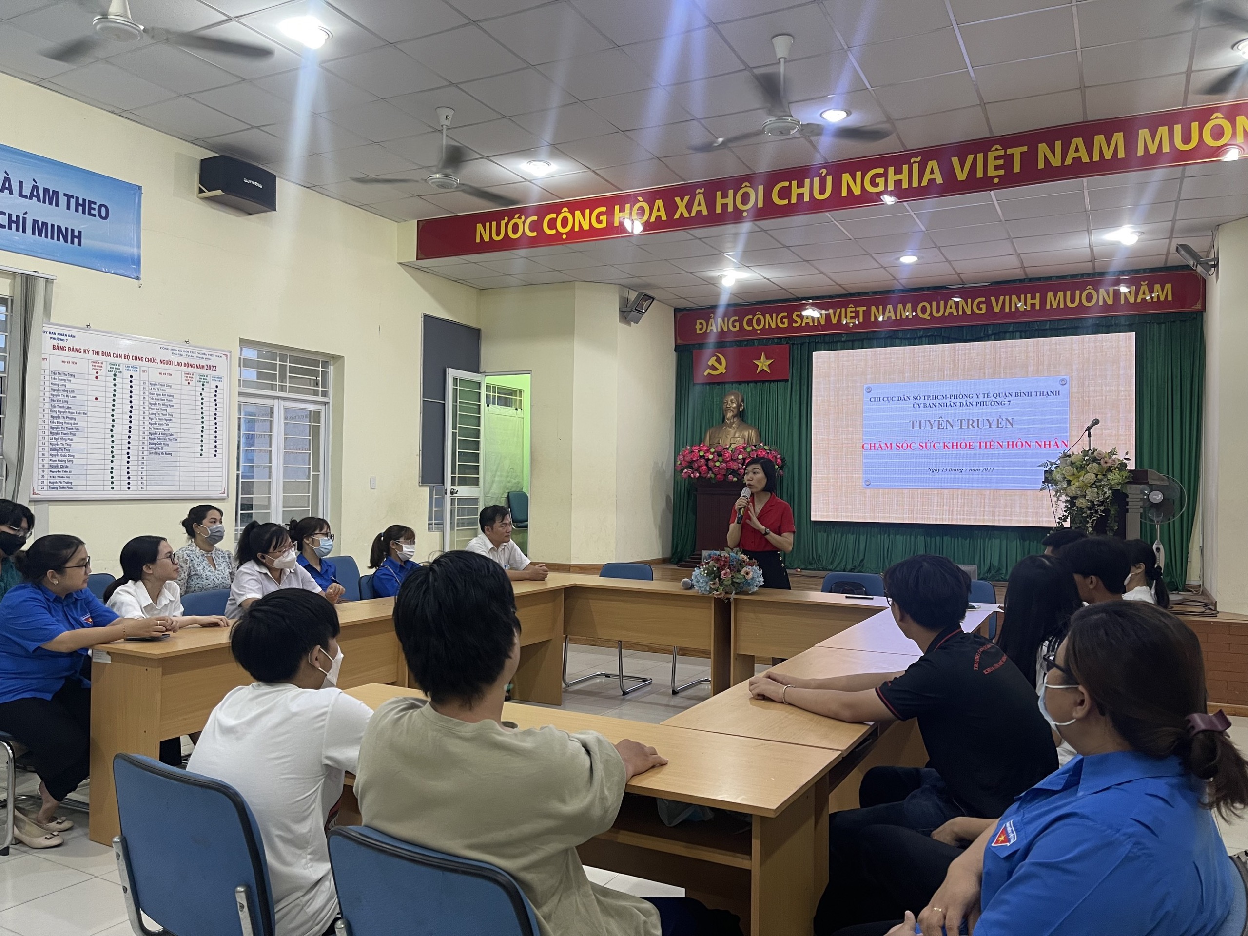 Bà Trần Thị Hồng – Phó Trưởng phòng khám sức khỏe sinh sản thành phố tại buổi nói chuyện với đoàn viên, thanh niên Phường 07 về “Chăm sóc sức khỏe tiền hôn nhân”