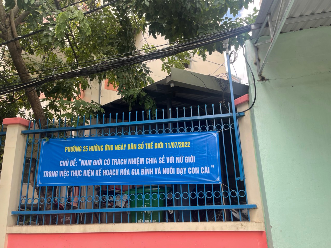 Băng rôn hưởng ứng ngày dân số Thế giới 11/7 tại UBND Phường 25.