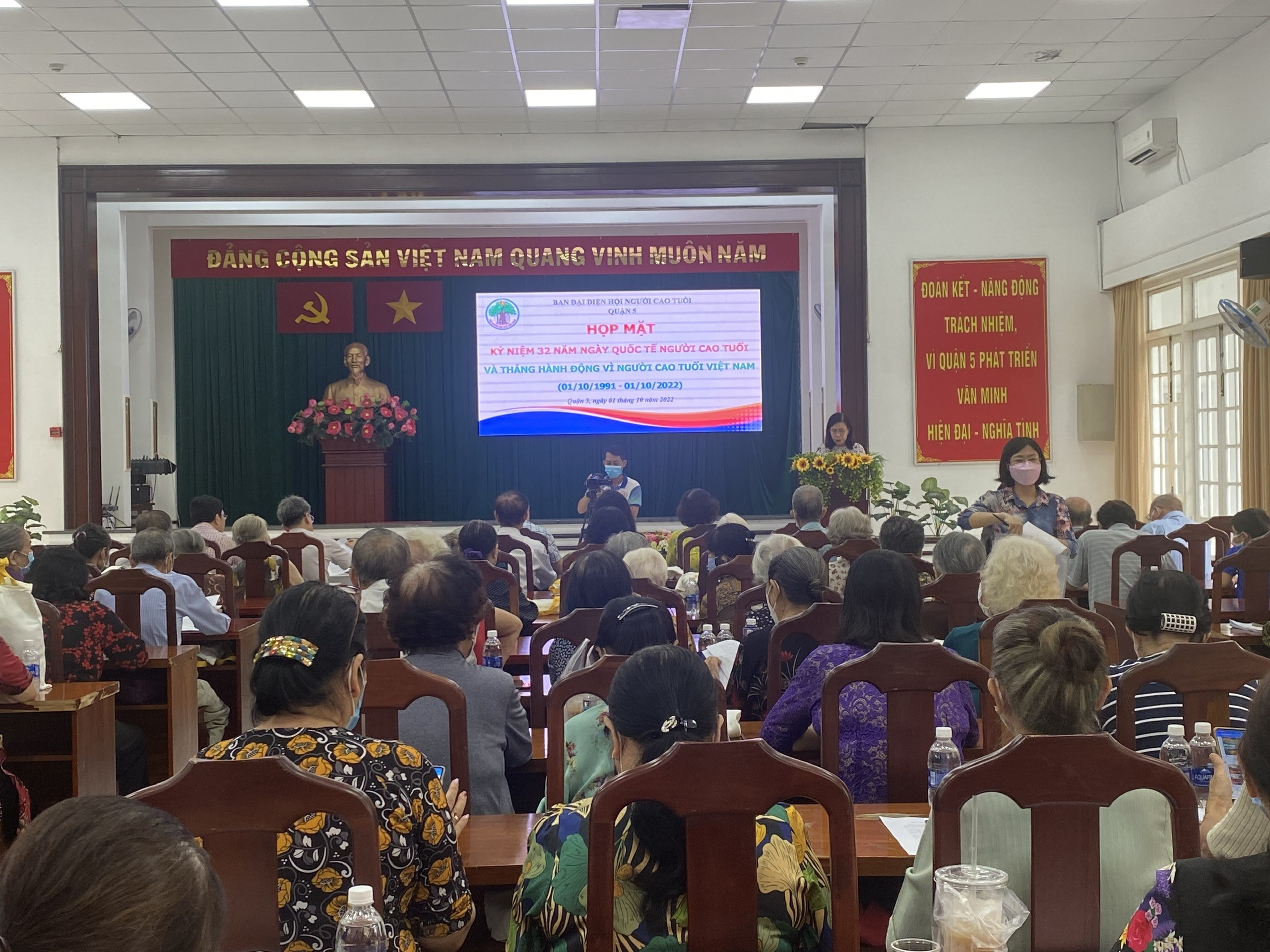 Vào lúc 7 giờ 30, ngày 01/10/2022, tại Hội trường 118 Ngô Quyền, Phường 8, Quận 5, Phòng Y tế Quận 5 phối hợp cùng Ban đại diện Người cao tuổi đã tổ chức Họp mặt Ngày Quốc tế Người cao tuổi, tháng hành động vì người cao tuổi, truyền thông “Chăm sóc sức khoẻ người cao tuổi” và chăm lo cho người cao tuổi khó khăn trên địa bàn quận. Đến tham dự có các đồng chí lãnh đạo Đảng, Chính quyền, Ban ngành, Đoàn thể, tổ chức chính trị – xã hội của quận, báo cáo viên: bà Trần Thị Hồng – Phó trưởng Phòng khám SKSS – KHHGĐ thuộc Chi cục DS-KHHGĐ Thành phố và sự tham gia của hơn 170 người cao tuổi trên địa bàn quận.