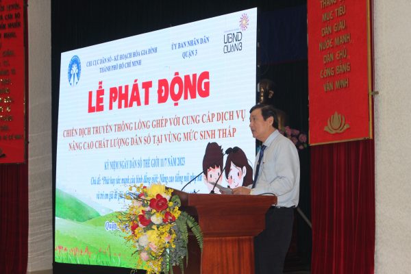 Vào lúc 7 giờ, thứ sáu ngày 14 tháng 7 năm 2023 tại Hội trường Ủy ban nhân dân Quận 3, Ban Chỉ đạo Dân số và Phát triển Thành phố Hồ Chí Minh phát động Chiến dịch truyền thông lồng ghép cung cấp dịch vụ nâng cao chất lượng dân số tại vùng mức sinh thấp; Kỷ niệm Ngày Dân số Thế giới 11/7 năm 2023 với hơn 400 đại biểu tham dự, bao gồm Tiến sĩ Phạm Vũ Hoàng – Phó Tổng cục Trưởng; Tiến sĩ Phạm Minh Sơn, Vụ Trưởng Vụ Pháp chế Thanh tra, Tổng cục Dân số – Kế hoạch hóa gia đình, Bộ Y tế; BS.CKII.Nguyễn Hữu Hưng – Phó Giám đốc Sở Y tế, các ông bà là thành viên Ban chỉ đạo Dân số và Phát triển cấp Thành phố, quận, huyện; chuyên trách và CTV dân số phường, xã, thị trấn.