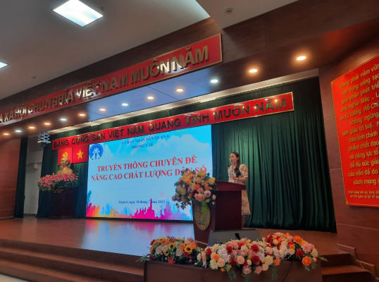 Nhằm nâng cao nhận thức của đội ngủ công tác viên và cán bộ làm công tác Dân số trên địa bàn quận, tại buổi Họp mặt Bà Trần Thị Ngọc Yến – Trưởng Phòng Dân số thuộc Chi cục Dân số – Kế hoạch hóa gia đình Thành phố báo cáo chuyên đề “Tầm quan trọng của việc nâng cáo chất lượng Dân số và thực trạng mức sinh tại Thành phố Hồ Chí Minh”.