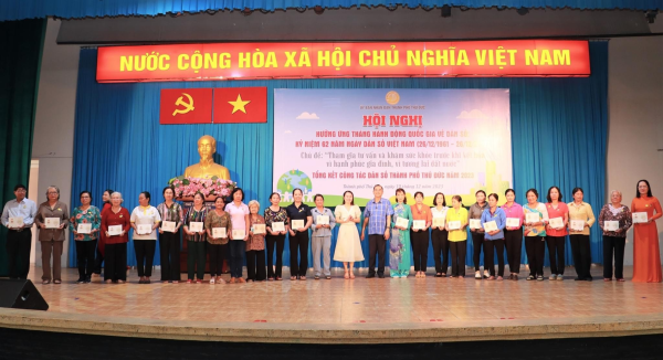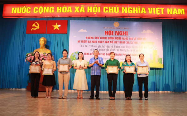 Dịp này, Ủy ban nhân dân thành phố Thủ Đức đã trao Kỷ niệm chương “Vì sự nghiệp Dân số” cho 32 cá nhân (theo Quyết định số 2144/QĐ-BYT ngày 15/5/2023 của Bộ Y tế); Khen tặng Giấy khen của Ủy ban nhân dân thành phố Thủ Đức cho 46 tập thể và 81 cá nhân đạt thành tích xuất sắc trong thực hiện công tác Dân số năm 2023 trên địa bàn thành phố Thủ Đức. Đặc biệt hưởng ứng Tháng hành động Quốc gia về Dân số, thực hiện chủ đề năm 2023 “Tham gia tư vấn và khám sức khỏe trước khi kết hôn vì hạnh phúc gia đình, vì tương lai đất nước” Ủy ban nhân dân thành phố Thủ Đức đã khen thưởng đối với 07 tập thể đạt thành tích xuất sắc trong vận động người dân khám sức khỏe trước khi kết hôn năm 2023 trên địa bàn thành phố Thủ Đức.
