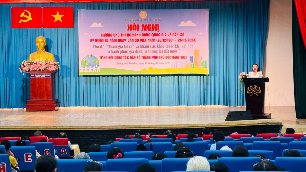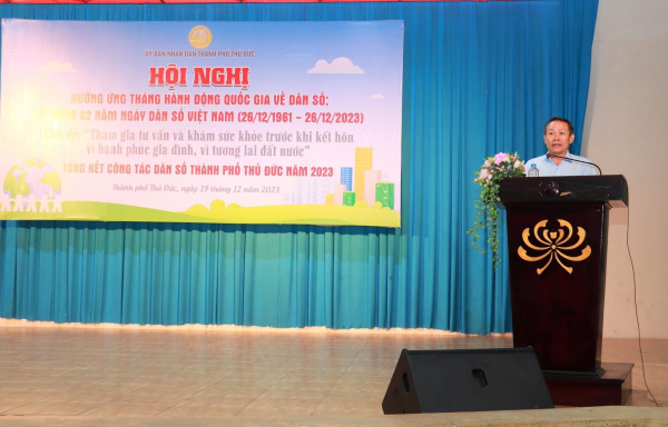 Tại Hội nghị Ông Nguyễn Văn Khuôn – Trưởng phòng Y tế thành phố Thủ Đức đã ôn lại ý nghĩa Ngày Dân số Việt Nam; báo cáo kết quả thực hiện các chỉ tiêu nhiệm vụ công tác Dân số tại thành phố Thủ Đức năm 2023: Tỷ lệ phát triển dân số tự nhiên đạt 8,36‰ (tăng 0,06‰ so với cùng kỳ năm 2023); Tỷ lệ bà mẹ mang thai được sàng lọc trước sinh đạt 92,53% so với chỉ tiêu năm 2023 là 85%; Tỷ lệ trẻ sinh ra được sàng lọc sơ sinh đạt 84,08% so với chỉ tiêu năm 2023 là 82%. Số người thực hiện các biện pháp tránh thai hiện đại đạt 154,05 % so với chỉ tiêu được giao; Khám sức khỏe tiền hôn nhân theo hình thức xã hội hóa đạt tỷ lệ 100%, tăng 62,89% so với năm 2023; Số người được khám sức khỏe định kỳ trong năm 2023 là 21.746/21.267 người, đạt 102,25% tăng 15% so với cùng kỳ năm 2022; Công tác kiểm tra, giám sát được tăng cường; Tổ chức bộ máy từ thành phố đến phường được củng cố, kiện toàn, nâng cao năng lực quản lý, thực hiện thông công tác đào tạo, bồi dưỡng, tâp huấn.