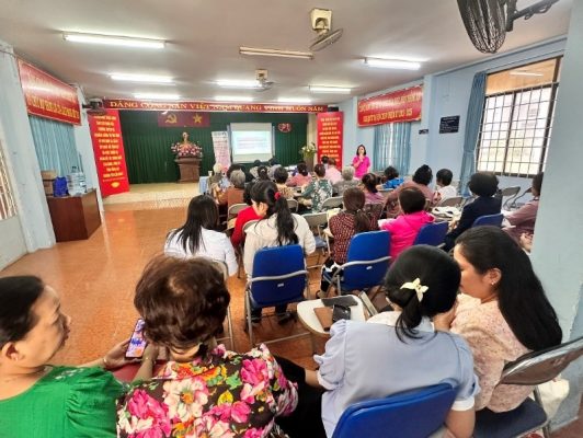 Bác sĩ Xuân Trạm Y tế P6 Q4 cùng người dân trong buổi truyền thông Mất cân bằng giới tính khi sinh tại P6 Q4