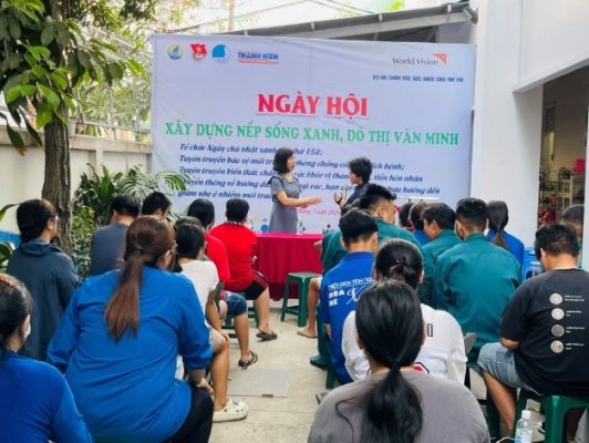 Thạc sĩ Trần Thị Hồng – Phó Trưởng phòng Phòng khám sức khỏe sinh sản/Kế hoạch hóa gia đình – Chi cục DS-KHHGĐ TPHCM cùng các bạn thanh niên và lực lượng dân quân tham gia tuyên truyền Chăm sóc sức khỏe Tiền hôn nhân.