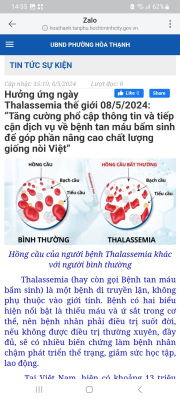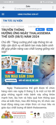 Hưởng ứng Ngày Thalassemia thế giới 08/5 với chủ đề: “Tăng cường phổ cập thông tin và tiếp cận dịch vụ về bệnh tan máu bẩm sinh để góp phần nâng cao chất lượng giống nòi Việt”, quận Tân Phú tổ chức nhiều hoạt động như: chạy bảng điện tử; treo băng rôn; tuyên truyền trên trang tin điện tử, mạng xã hội…Nhằm tăng cường tuyên truyền, giáo dục cho người dân về nguy cơ của việc kết hôn cận huyết thống với bệnh Thalassemia (tan máu bẩm sinh) cũng như về tầm quan trọng của việc tư vấn và khám sức khỏe trước khi kết hôn; tầm soát, chẩn đoán, điều trị sớm bệnh, tật trước sinh và sơ sinh; nguyên nhân, hệ lụy của bệnh tan máu bẩm sinh đối với cộng đồng và xã hội.