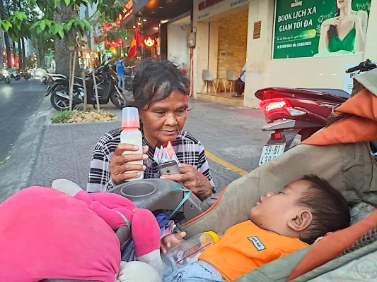 Trưa, nắng như đổ lửa, tiếng rao “vé số… vé số đây” của bà Nguyễn Thị Cau (77 tuổi, phường Bình San, TP Hà Tiên, Kiên Giang) lọt thỏm giữa dòng người và xe trên đường Bùi Thị Xuân, quận 1, TPHCM. Vóc dáng gầy nhom, gương mặt đen sạm khắc khổ, bà khó nhọc đẩy chiếc xe lôi cũ mèm, bên trong có bé trai nằm cuộn tròn thiêm thiếp. Đẩy một quãng, bà lại đứng thở dốc vì mệt. Gần 3 giờ đi hết quãng đường khoảng 5km trên một số tuyến phố của phường Bến Nghé và Phạm Ngũ Lão, xấp vé số trong tay bà gần như còn nguyên.