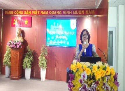 Bà Ngô Thị Thanh Thảo – Phó Trưởng Phòng Truyền thông giáo dục, Chi cục Dân số – Kế hoạch hóa gia đình báo cáo trước Hội nghị tại Ủy ban nhân dân Phường 1, 2, 4, 8, 11, 12 quận Tân Bình