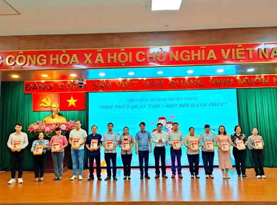 Hình ảnh trao bảng QR mô hình “ Một phút quan tâm – một đời hạnh phúc” cho lãnh đạo 14 phường