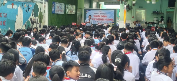 BS.CKI. Nguyễn Văn Hùng, Trưởng Phòng Truyền thông – Giáo dục thuộc Chi cục Dân số – Kế hoạch hóa gia đình Thành phố truyền thông chăm sóc sức khỏe vị thành niên tại trường THCS Yên Thế