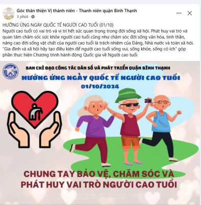 Căn cứ Kế hoạch số 59/KH-CCDS ngày 18 tháng 9 năm 2024 của Chi cục Dân số – Kế hoạch hóa gia đình Thành phố Hồ Chí Minh, Quận Bình Thạnh đã xây dựng Kế hoạch số 275/KH-UBND-YT ngày 25 tháng 9 năm 2024 về tổ chức hoạt động truyền thông hưởng ứng Ngày tránh thai thế giới (26/9), Ngày quốc tế người cao tuổi (01/10), Ngày quốc tế trẻ em gái (11/10) năm 2024.