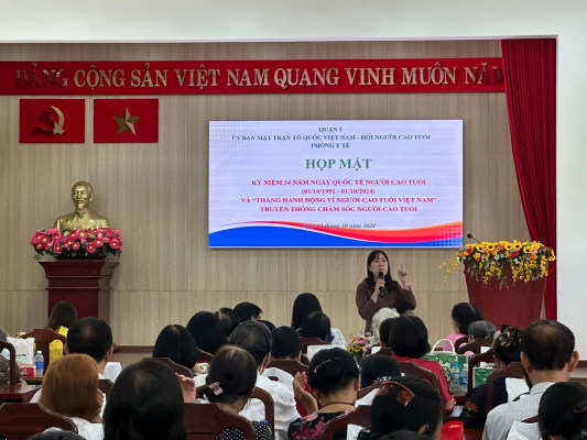 Nhân dịp Họp mặt kỷ niệm 34 năm, ngày Quốc tế người cao tuổi 01/10 và Tháng hành động người cao tuổi Việt Nam. Chiều ngày 02/10/2024, tại Hội trường 118 Ngô Quyền, Phường 8, Quận 5; Phòng Y tế phối hợp cùng Ban Thường trực Uỷ ban Mặt trận Tổ quốc, Ban đại diện Người cao tuổi Quận 5 tổ chức Truyền thông Chăm sóc sức khỏe Người cao tuổi. Đến tham dự có Bà Đoàn Thị Cẩm Hồng, Phó Trưởng phòng DS-KHHGĐ – Chi cục DS-KHHGĐ Thành phố và các ông bà lãnh đạo Đảng, Chính quyền, Ban ngành, Đoàn thể, tổ chức chính trị – xã hội của quận;