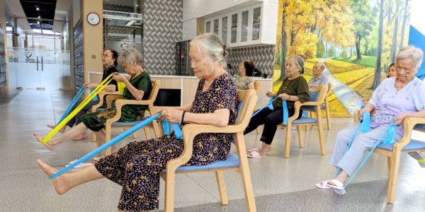 | Các cụ tập luyện bài thể dục với dây thun tại trung tâm dưỡng lão Nhân Ái – Ảnh: M.T. |