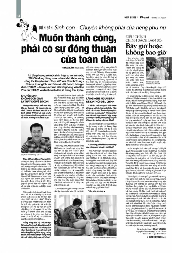 Là địa phương có mức sinh thấp, số với cả nước, TPHCM đang đứng trước nhiều khó khăn trong công tác khuyến sinh. Thạc sĩ Phạm Chánh Trung – Chi cục trưởng Chi cục Dân số – Kế hoạch hoá gia đình TPHCM, đã có cuộc trao đổi với phóng viên Báo phụ nữ TPHCM về chính sách Dân số trong thời kỳ tới.