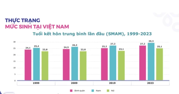 Tuổi kết hôn trung bình lần đầu thay đổi theo hướng kết hôn muộn hơn. Tăng từ 24,1 tuổi (năm 1999) lên 25,2 tuổi (2019). Sau 4 năm, đến năm 2023 tuổi kết hôn lần đầu tiếp tục tăng thêm 2 tuổi và hiện là 27,2 tuổi. Với nam giới, tuổi kết hôn trung bình lần đầu là 29,3 và nữ giới là 25,1. Cùng đó, phụ nữ thành thị sinh muộn và sinh con ít hơn phụ nữ nông thôn.