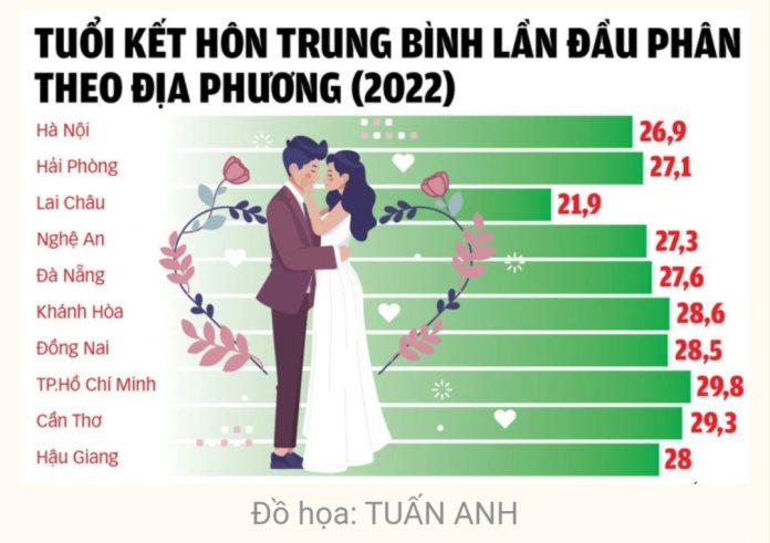 – Theo số liệu mới nhất của năm 2022, TP.HCM có độ tuổi kết hôn trung bình lần đầu cao nhất so với các tỉnh thành trong cả nước, cao hơn 2,9 tuổi so với số liệu chung của cả nước (Việt Nam là 26,9 tuổi).